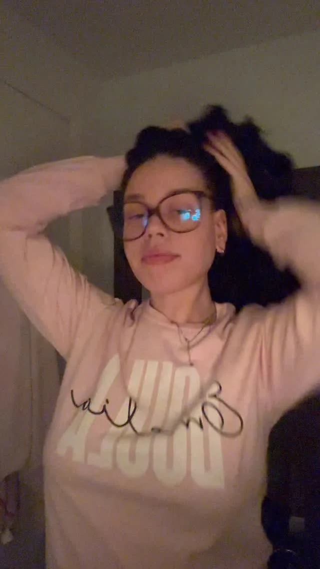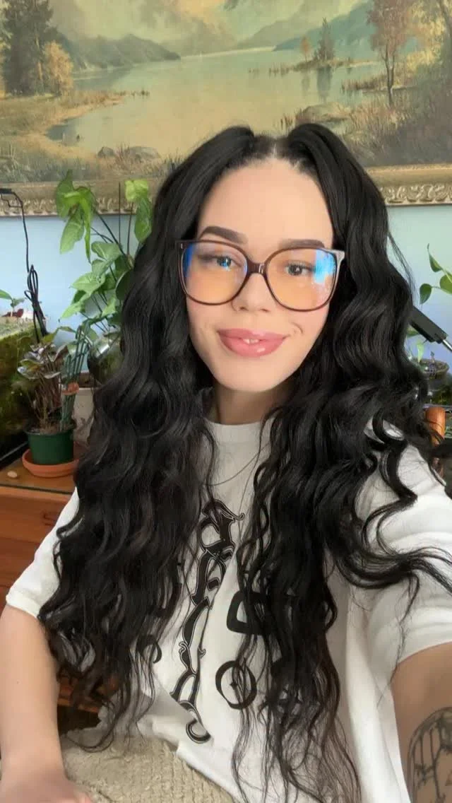 Close-up of a woman with long, curly dark hair, wearing large glasses with tinted lenses, smiling and showing her teeth.